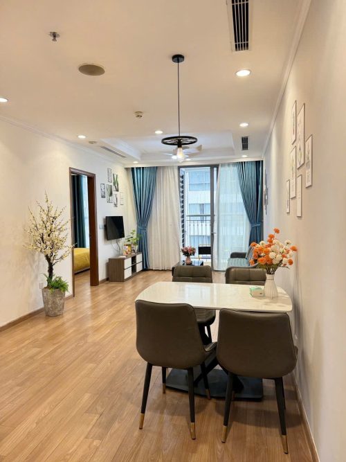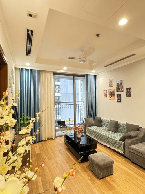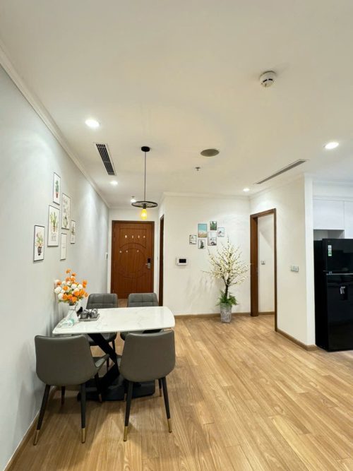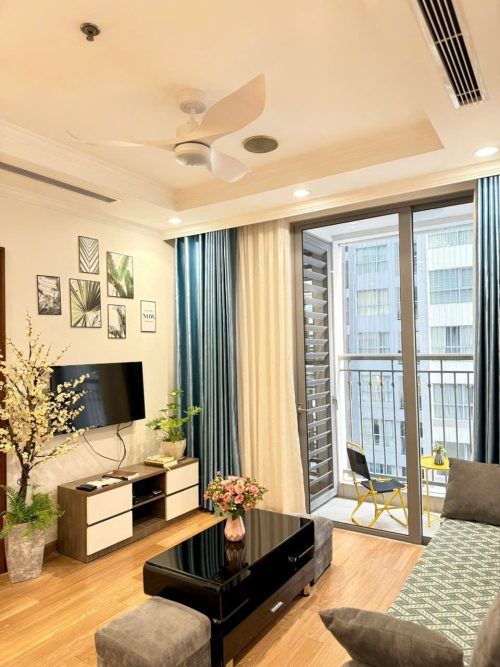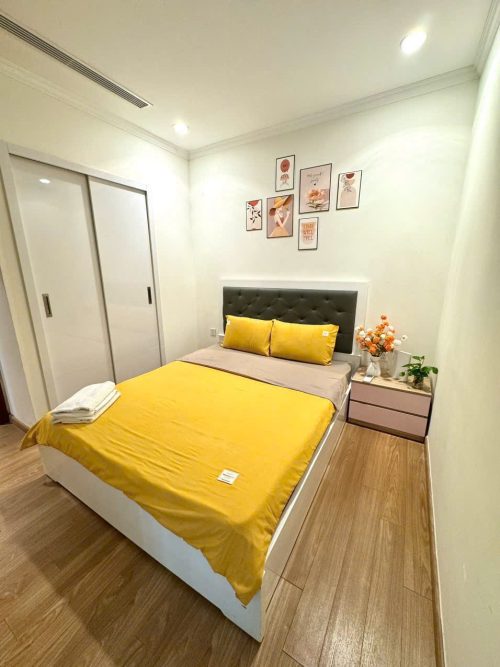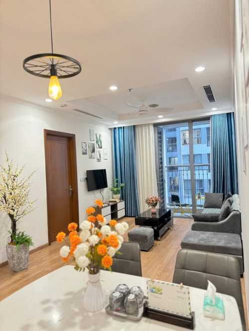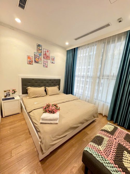 Căn hộ gồm 2 phòng ngủ riêng biệt, phòng khách rộng rãi, bếp đầy đủ dụng cụ nấu ăn, máy giặt, wifi tốc độ cao và ban công thoáng mát. Khách lưu trú còn được tận hưởng tiện ích nội khu như trung tâm thương mại Vincom, siêu thị, rạp chiếu phim, khu vui chơi trẻ em và hồ điều hòa trong xanh.